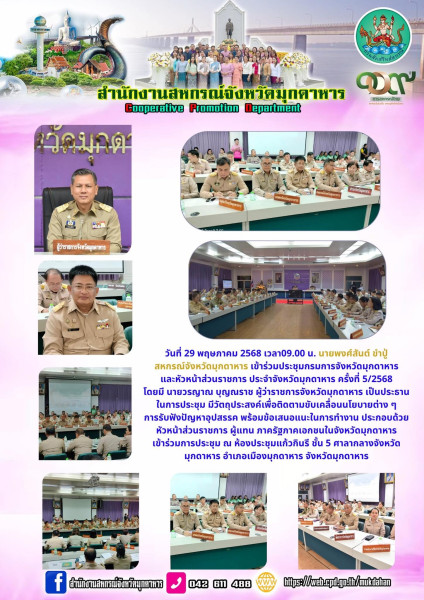 วันที่ 29 พฤษภาคม 2568 เวลา09.00 น. นายพงศ์สันต์ ขำปู่ สหกรณ์จังหวัดมุกดาหาร เข้าร่วมประชุมกรมการจังหวัดมุกดาหาร และหัวหน้าส่วนราชการ ประจำจังหวัดมุกดาหาร ครั้งที่ 5/2568 โดยมี นายวรญาณ บุญณราช ผู้ว่าราชการจังหวัดมุกดาหาร เป็นประธานในการประชุม มีวัตถุประสงค์เพื่อติดตามขับเคลื่อนนโยบายต่าง ๆ การรับฟังปัญหาอุปสรรค พร้อมข้อเสนอแนะในการทำงาน ประกอบด้วยหัวหน้าส่วนราชการ ผู้แทน ภาครัฐภาคเอกชนในจังหวัดมุกดาหาร เข้าร่วมการประชุม ณ ห้องประชุมแก้วกินรี ชั้น 5 ศาลากลางจังหวัดมุกดาหาร อำเภอเมืองมุกดาหาร จังหวัดมุกดาหาร