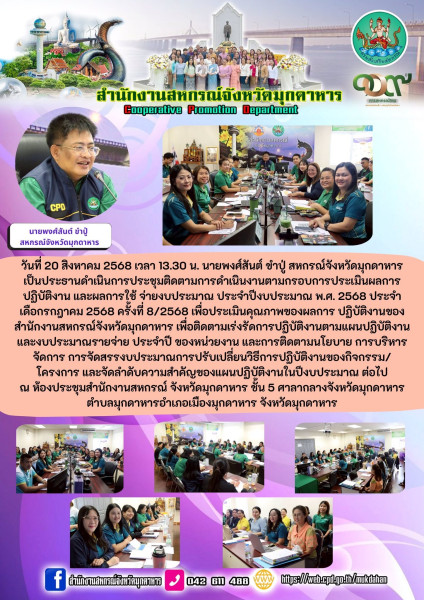 วันที่ 20 สิงหาคม 2568 เวลา 13.30 น. นายพงศ์สันต์ ขำปู่ สหกรณ์จังหวัดมุกดาหารเป็นประธาน ดำเนินการประชุมติดตามการดำเนินงานตามกรอบการประเมิน ผลการปฏิบัติงาน และผลการใช้จ่ายงบประมาณประจำปีงบประมาณ พ.ศ. 2568 ประจำเดือกรกฎาคม 2568 ครั้งที่ 8/2568เพื่อประเมินคุณภาพของผลการปฏิบัติงานของสำนักงานสหกรณ์จังหวัดมุกดาหาร เพื่อติดตามเร่งรัดการปฏิบัติงานตามแผนปฏิบัติงาน และงบประมาณรายจ่าย ประจำปี ของหน่วยงาน และการติดตามนโยบาย การบริหารจัดการ การจัดสรรงบประมาณการปรับเปลี่ยนวิธีการปฏิบัติงานของกิจกรรม/โครงการ และจัดลำดับความสำคัญของแผนปฏิบัติงานในปีงบประมาณ ต่อไป ณ ห้องประชุมสำนักงานสหกรณ์ จังหวัดมุกดาหาร ชั้น 5 ศาลากลางจังหวัดมุกดาหาร ตำบลมุกดาหารอำเภอเมืองมุกดาหาร จังหวัดมุกดาหาร