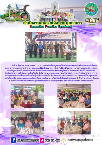 วันที่ 21 สิงหาคม 2568 เวลา 07.00 น. นายพงศ์สันต์ ขำปู่ สหกรณ์จังหวัดมุกดาหารพร้อมด้วยบุคลากรสำนักงานสหกรณ์จังหวัดมุกดาหาร เข้าร่วมงานสภากาแฟจังหวัดมุกดาหาร ครั้งที่ 11/2568 โดยนายวรญาณ บุญณราช ผู้ว่าราชการจังหวัดมุกดาหารเป็นประธานเปิดงาน ซึ่งมีหน่วยงานราชการหน่วยงานรัฐวิสาหกิจ เหล่ากาชาดและแม่บ้านมหาดไทยจังหวัดมุกดาหาร องค์กรปกครองส่วนท้องถิ่น ผู้บริหารองค์กรภาคเอกชน ชมรม/สมาคมต่าง ๆ ของจังหวัดมุกดาหาร เข้าร่วมกิจกรรมการจัดงาน เพื่อแลกเปลี่ยนเรียนรู้ รับฟังความคิดเห็น ข้อเสนอแนะแนวทางการดำเนินงาน และการแก้ไขปัญหาต่าง ๆ ร่วมกันทั้งภาครัฐ ภาคเอกชน และภาคประชาสังคม โดยมีหน่วยงานในสังกัดสำนักงานตำรวจแห่งชาติ เป็นเจ้าภาพในการจัดงานฯ ณลานอาคารกองบังคับการตรวจภูธรจังหวัดมุกดาหาร ตำบลมุกดาหาร อำเภอเมืองมุกดาหาร จังหวัดมุกดาหาร