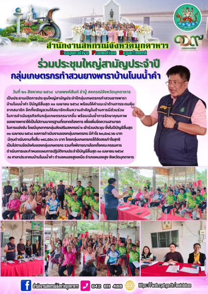 วันที่ ๒๑ สิงหาคม ๒๕๖๘ นายพงศ์สันต์ ขำปู่ สหกรณ์จังหวัดมุกดาหาร เป็นประธานเปิดการประชุมใหญ่สามัญประจำปีกลุ่มเกษตรกรทำสวนยางพาราบ้านโนนน้ำคำ ปีบัญชีสิ้นสุด ๓๐ เมษายน ๒๕๖๘ พร้อมให้คำแนะนำด้านการระดมหุ้นจากสมาชิก อีกทั้งเชิญชวนให้สมาชิกเห็นความสำคัญในด้านการมีส่วนร่วมในการดำเนินธุรกิจกับกลุ่มเกษตรกรมากขึ้น พร้อมเน้นย้ำการรักษาคุณภาพของยางพาราให้เป็นไปตามมาตรฐานที่ตลาดต้องการ เพื่อเพิ่มขีดความสามารถในการแข่งขัน โดยมีบุคลากรกลุ่มส่งเสริมสหกรณ์ ๒ เข้าร่วมประชุม ซึ่งในปีบัญชีสิ้นสุด ๓๐ เมษายน ๒๕๖๘ ผลการดำเนินงานของกลุ่มเกษตรกร มีกำไร ๒๓,๕๓๔.๖๒ บาท มีทุนดำเนินงานทั้งสิ้น ๑๙๘,๕๕๓.๖๖ บาท โดยกลุ่มเกษตรกรได้จัดสรรกำไรสุทธิเป็นไปตามข้อบังคับของกลุ่มเกษตรกร รวมทั้งพิจารณาเลือกตั้งคณะกรรมการดำเนินการและกำหนดแผนการปฏิบัติงานประจำปีบัญชีสิ้นสุด ๓๐ เมษายน ๒๕๖๙ ณ ศาลาประชาคมบ้านโนนน้ำคำ ตำบลหนองสูงเหนือ อำเภอหนองสูง จังหวัดมุกดาหาร
