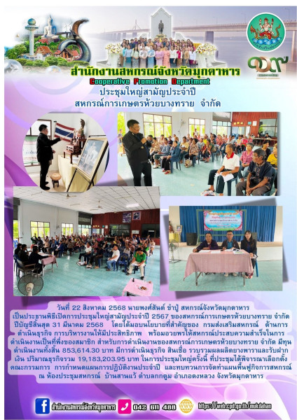 วันที่ 22 สิงหาคม 2568 นายพงศ์สันต์ ขำปู่ สหกรณ์จังหวัดมุกดาหาร เป็นประธานพิธีเปิดการประชุมใหญ่สามัญประจำปี 2567 ของสหกรณ์การเกษตรห้วยบางทราย จำกัด ปีบัญชีสิ้นสุด 31 มีนาคม 2568 โดยได้มอบนโยบายที่สำคัญของ กรมส่งเสริมสหกรณ์ ด้านการดำเนินธุรกิจ การบริหารงานให้มีประสิทธิภาพ พร้อมอวยพรให้สหกรณ์ประสบความสำเร็จในการดำเนินงานเป็นที่พึ่งของสมาชิก สำหรับการดำเนินงานของสหกรณ์การเกษตรห้วยบางทราย จำกัด มีทุนดำเนินงานทั้งสิ้น 853,614.30 บาท มีการดำเนินธุรกิจ สินเชื่อ รวบรวมผลผลิตยางพาราและรับฝากเงิน ปริมาณธุรกิจรวม 19,183,203.95 บาท ในการประชุมใหญ่ครั้งนี้ ที่ประชุมได้พิจารณาเลือกตั้งคณะกรรมการ การกำหนดแผนการปฏิบัติงานประจำปี และทบทวนการจัดทำแผนพื้นฟูกิจการสหกรณ์ ณ ห้องประชุมสหกรณ์ บ้านสานแว้ ตำบลกกตูม อำเภอดงหลวง จังหวัดมุกดาหาร