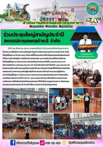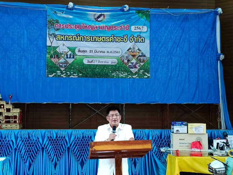 วันที่ ๒๗ สิงหาคม ๒๕๖๘ นายพงศ์สันต์ ขำปู่ สหกรณ์จังหวัดมุกดาหาร เป็นประธานพิธีเปิดการประชุมใหญ่สามัญประจำปีของสหกรณ์การเกษตรคำชะอี จำกัด ปีบัญชีสิ้นสุด ๓๑ มีนาคม ๒๕๖๘ ในโอกาสนี้ได้มอบนโยบายที่สำคัญของกรมส่งเสริมสหกรณ์ ทั้งด้านการดำเนินธุรกิจ การมีส่วนร่วมของสมาชิกและการบริหารงานให้มีประสิทธิภาพ ในปีบัญชีสิ้นสุด ๓๑ มีนาคม ๒๕๖๘ สหกรณ์มีทุนดำเนินงานทั้งสิ้น ๓๗,๕๑๕,๙๙๖.๕๓ บาท ปริมาณธุรกิจรวม ๑๗๒,๗๒๐,๔๘๓.๗๖ บาท ผลการดำเนินงานมีกำไรสุทธิ ๑,๑๒๑,๖๒๙.๔๗ บาท โดยสหกรณ์มีการพิจารณาอนุมัติงบการเงินพิจารณาจัดสรรกำไรสุทธิให้เป็นไปตามข้อบังคับของสหกรณ์ การกำหนดวงเงินกู้ยืมหรือค้ำประกันประจำปีการกำหนดแผนปฏิบัติงาน ประจำปีบัญชีสิ้นสุด ๓๑ มีนาคม ๒๕๖๙ การทบทวนแผนกลยุทธ์ของสหกรณ์ การขับเคลื่อนแผนพัฒนาสหกรณ์ ฉบับที่ ๕ (ปี พ.ศ. ๒๕๖๖-๒๕๗๐) พิจารณาเลือกตั้งคณะกรรมการและการพิจารณาแก้ไขเพิ่มเติมข้อบังคับของสหกรณ์ ให้เป็นไปตามกฎกระทรวงฯ ณห้องประชุมศาลาประชาคมอำเภอคำชะอี ตำบลน้ำเที่ยง อำเภอคำชะอี จังหวัดมุกดาหาร