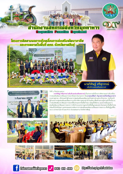 วันที่ ๑ กันยายน ๒๕๖๘ นายวิศิษฐ์ ศรีสุวรรณ์ อธิบดีกรมส่งเสริมสหกรณ์ เป็นประธานเปิดโครงการติดตามผลการขับเคลื่อนการส่งเสริมพัฒนาอาชีพและการตลาดในสถาบันเกษตรกร โดยนายพงศ์สันต์ ขำปู่ สหกรณ์จังหวัดมุกดาหาร นางสาวสุภาพร ศรีประสงค์ ผู้อำนวยการกลุ่มส่งเสริมและพัฒนาธุรกิจสหกรณ์ และนางจิรพรรณ ประดับชาติ ผู้อำนวยการกลุ่มส่งเสริมและพัฒนาการบริหารจัดการสหกรณ์ เข้าร่วมด้วยเพื่อสร้างความรู้ความเข้าใจนโยบายการส่งเสริมพัฒนาอาชีพและการตลาดให้แก่เกษตรกรในพื้นที่ คทช. พร้อมทั้งติดตาม และตรวจเยี่ยมผลการส่งเสริมพัฒนาอาชีพและการตลาด การจัดทำระบบสาธารณูประโภคขั้นพื้นฐานของสถาบันเกษตรกรในพื้นที่ คทช.พร้อมทั้งรับฟังปัญหา อุปสรรคและความต้องการการส่งเสริมและพัฒนาอาชีพและการตลาด ณ พื้นที่ปฏิรูปที่ดิน (ส.ป.ก.)ป่าดงป่าเผด ตำบลนาจำปา อำเภอดอนจาน จังหวัดกาฬสินธุ์