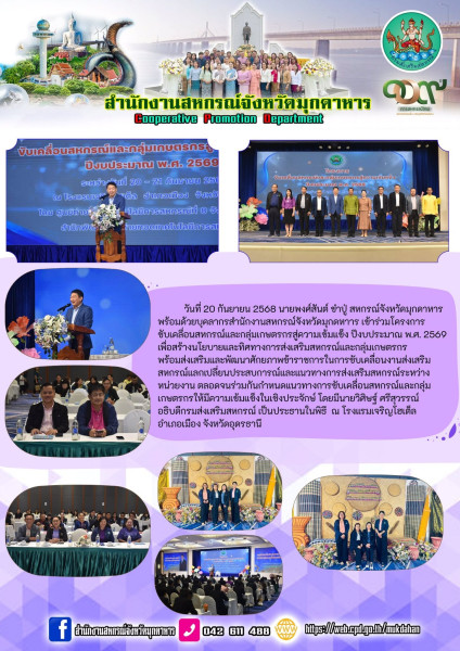 วันที่ 20 กันยายน 2568 นายพงศ์สันต์ ขำปู่ สหกรณ์จังหวัดมุกดาหาร พร้อมด้วยบุคลากรสำนักงานสหกรณ์จังหวัดมุกดหาาร เข้าร่วมโครงการขับเคลื่อนสหกรณ์และกลุ่มเกษตรกรสู่ความเข้มแข็ง ปีงบประมาณ พ.ศ. 2569 เพื่อสร้างนโยบายและทิศทางการส่งเสริมสหกรณ์ และกลุ่มเกษตรกร พร้อมส่งเสริมและพัฒนาศักยภาพข้าราชการในการขับ เคลื่อนงานส่งเสริมสหกรณ์แลกเปลี่ยนประสบการณ์ และแนวทางการส่งเสริมสหกรณ์ระหว่างหน่วยงาน ตลอดจนร่วมกันกำหนดแนวทางการขับเคลื่อนสหกรณ์และกลุ่มเกษตรกรให้มีความเข้มแข็งในเชิงประจักษ์ โดยมีนายวิศิษฐ์ ศรีสุวรรณ์ อธิบดีกรมส่งเสริมสหกรณ์ เป็นประธานในพิธี ณ โรงแรมเจริญโฮเต็ล อำเภอเมือง จังหวัดอุดรธานี