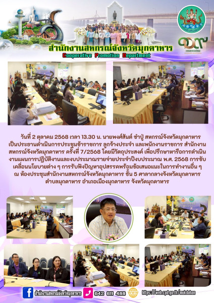 วันที่ 2 ตุลาคม 2568 เวลา 13.30 น. นายพงศ์สันต์ ขำปู่ สหกรณ์จังหวัดมุกดาหาร เป็นประธานดำเนินการประชุมข้าราชการ ลูกจ้างประจำ และพนักงานราชการ สำนักงานสหกรณ์จังหวัดมุกดาหาร ครั้งที่ 7/2568 โดยมีวัตถุประสงค์ เพื่อปรึกษาหารือการดำเนินงานแผนการปฏิบัติ งานและงบประมาณรายจ่ายประจำปีงบประมาณ พ.ศ. 2568 การขับเคลื่อนนโยบายต่าง ๆ การรับฟังปัญหาอุปสรรคพร้อม ข้อเสนอแนะในการทำ งานอื่น ๆ ณ ห้องประชุมสำนักงาน สหกรณ์จังหวัดมุกดาหาร ชั้น 5 ศาลากลางจังหวัดมุกดาหาร ตำบลมุกดาหาร อำเภอเมืองมุกดาหาร จังหวัดมุกดาหาร