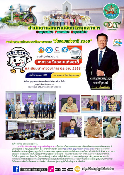 วันที่ 6 ตุลาคม 2568 เวลา 09.00 น. นายไกร เอี่ยมจุฬา รองผู้ว่าราชการจังหวัดมุกดาหาร เป็นประธานในประชุมคณะกรรมการจัดงานโครงการมหกรรมวันออมแห่งชาติ ประจำปี 2568 ณ ห้องประชุมแก้วกินรี ชั้น 5 ศาลากลางจังหวัด โดยมี นายพงศ์สันต์ ขำปู่ สหกรณ์จังหวัดมุกดาหาร นายกองค์การบริหารส่วนจังหวัด สมาชิกสภาผู้แทนราษฎรจังหวัด ประธานกรรมการชุมนุมสหกรณ์ออมทรัพย์แห่งประเทศไทย จำกัด ปลัดจังหวัด หัวหน้าส่วนราชการและผู้แทน รวมถึงภาคเอกชนที่เกี่ยวข้องเข้าร่วมประชุมอย่างพร้อมเพรียง ในการประชุมฯ มีการแจ้งกำหนดการจัดงาน ซึ่งจะมีการจัดงานในวันที่ 31 ตุลาคม 2568 ซึ่งตรงกับ “วันออมแห่งชาติ” รวมถึงการแจ้งคำสั่งโครงการฯ การแถลงข่าว และการพิจารณามอบหมายภารกิจการจัดงานมหกรรมวันออมแห่งชาติ โดยการจัดงานนี้ มีจุดประสงค์เพื่อส่งเสริมวินัยทางการเงิน ซึ่งในปีนี้มีความยิ่งใหญ่และพิเศษกว่าที่ผ่านมา ในเรื่องของการส่งเสริมวัฒนธรรม การท่องเที่ยว เพื่อการกระตุ้นเศรษฐกิจในจังหวัดมุกดาหารร่วมด้วย