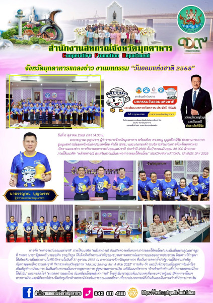 วันที่ 6 ตุลาคม 2568 เวลา 14.00 น. นายวรญาณ บุญณราช ผู้ว่าราชการจังหวัดมุกดาหาร พร้อมด้วย ดร.มะณู บุญศรีมณีชัย ประธานกรรมการชุมนุมสหกรณ์ออมทรัพย์แห่งประเทศไทย จำกัด (ชสอ.) และนายกองค์การบริหารส่วนราชการจังหวัดมุกดาหาร เปิดงานแถลงข่าว การจัดงานมหกรรมวันออมแห่งชาติ ประจำปี 2568 ตั้งเป้าระดมเงินออม 30,000 ล้านบาท ภายใต้แนวคิด “พลังสหกรณ์ ส่งเสริมความมั่นคงทางการออมให้คนไทย” MUKDAHAN NATIONAL SAVINGS DAY 2025 การจัด "มหกรรมวันออมแห่งชาติ" ภายได้แนวคิด "พลังสหกรณ์ ส่งเสริมความมั่นคงทางการออมให้คนไทย"และนับเป็นพระคุณอย่างสูง ที่ ฯพณฯ นายกรัฐมนตรี นายอนุทิน ชาญวีรกูล ได้เล็งเห็นถึงความสำคัญของขบวนการสหกรณ์และการออมของภาคประชาชน โดยท่านได้กรุณาให้เกียรติมาเป็นประธานในพิธีเปิดงานในวันที่ 31 ตุลาคม 2568 ณ ศาลากลางจังหวัดมุกดาหาร ซึ่งเป็นการดอกย้ำว่ารัฐบาลให้ความสำคัญกับการออมเป็นวาระแห่งชาติ กิจกรรมส่งเสริมสุขภาพ "Mekong Savings Run & Ride 2025" การเดิน-วิ่ง และปั่นจักรยานเพื่อสุขภาพริมฝั่งโขง เป็นสัญลักษณ์ของการเริ่มดันสร้างความมั่นคงจากสุขภาพกาย สู่สุขภาพทางการเงิน เวทีสัมมนาวิชาการ "ก้าวข้ามกับดัก-เพื่อโอกาสสหกรณ์ไทย ให้ยั่งยืน" และทอล์คโชว์ "อนาคตการออมไทย ขับเคลื่อนโดยพลังสหกรณ์" โดยผู้เชี่ยวชาญระดับประเทศเพื่อมอบความรู้และเปิดมุมมองใหม่ๆ ทางการเงิน และพิธีมอบโล่รางวัลเชิดชูเกียรติ"สหกรณ์ส่งเสริมการออมยอดเยี่ยม" เพื่อยกย่องสหกรณ์ที่เป็นต้นแบบในการสร้างวินัยทางการเงิน