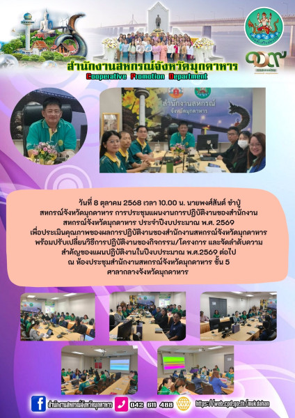 วันที่ 8 ตุลาคม 2568 เวลา 10.00 น. นายพงศ์สันต์ ขำปู่สหกรณ์จังหวัดมุกดาหารการประชุมแผนงานการปฏิบัติงานของสำนักงานสหกรณ์จังหวัดมุกดาหาร ประจำปีงบประมาณ พ.ศ. 2569 เพื่อประเมินคุณภาพของผลการปฏิบัติงาน ของสำนักงานสหกรณ์จังหวัดมุกดาหาร พร้อมปรับเปลี่ยนวิธีการปฏิบัติงานของกิจกรรม/โครงการและจัดลำดับความสำคัญของแผนปฏิบัติงานในปีงบประมาณ พ.ศ.2569 ต่อไป ณ ห้องประชุมสำนักงานสหกรณ์จังหวัดมุกดาหาร ชั้น 5 ศาลากลางจังหวัดมุกดาหาร