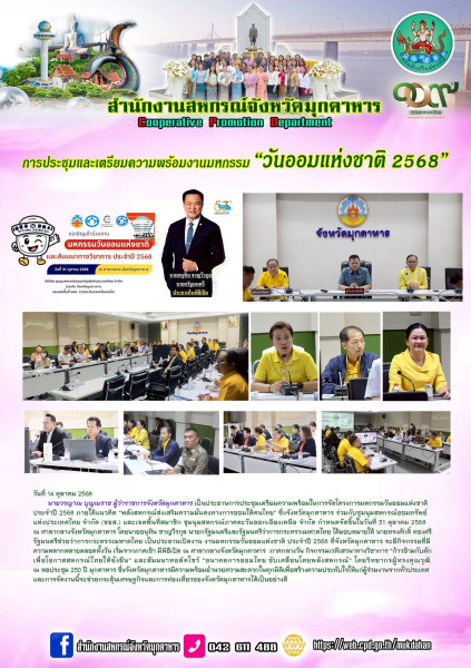 วันที่ 14 ตุลาคม 2568 นายวรญาณ บุญณราช ผู้ว่าราชการจังหวัดมุกดาหาร เป็นประธานการประชุมเตรียมความพร้อมในการจัดโครงการมหกรรมวันออมแห่งชาติ ประจำปี 2568 ภายใต้แนวคิด "พลังสหกรณ์ส่งเสริมความมั่นคงทางการออมให้คนไทย" ซึ่งจังหวัดมุกดาหาร ร่วมกับชุมนุมสหกรณ์ออมทรัพย์แห่งประเทศไทย จำกัด (ชอส.) และเขตพื้นที่สมาชิก ชุมนุมสหกรณ์ภาคตะวันออกเฉียงเหนือ จำกัด กำหนดจัดขึ้นในวันที่ 31 ตุลาคม 2568 ณ ศาลากลางจังหวัดมุกดาหาร โดยนายอนุทิน ชาญวีรกุล นายกรัฐมนตรีและรัฐมนตรีว่าการกระทรวงมหาดไทย ได้มอบหมายให้ นายทรงศักดิ์ ทองศรี รัฐมนตรีช่วยว่าการกระทรวงมหาดไทย เป็นประธานเปิดงาน งานมหกรรมวันออมแห่งชาติ ประจำปี 2568 ที่จังหวัดมุกดาหาร จะมีกิจกรรมที่มีความหลากหลายตลอดทั้งวัน เริ่มจากภาคเช้า มีพิธีเปิด ณ ศาลากลางจังหวัดมุกดาหาร ภาคกลางวัน กิจกรรมเวทีเสวนาทางวิชาการ "ก้าวข้ามกับดัก เพื่อโอกาสสหกรณ์ไทยให้ยั่งยืน" และสัมมนาทอล์คโชว์ "อนาคตการออมไทย ขับเคลื่อนโดยพลังสหกรณ์" โดยวิทยากรผู้ทรงคุณวุฒิ ณ หอประชุม 250 ปี มุกดาหาร ซึ่งจังหวัดมุกดาหารมีความพร้อมอํานวยความสะดวกในทุกมิติเพื่อสร้างความประทับใจให้แก่ผู้ร่วมงานจากทั่วประเทศ และการจัดงานนี้จะช่วยกระตุ้นเศรษฐกิจและการท่องเที่ยวของจังหวัดมุกดาหารได้เป็นอย่างดี
