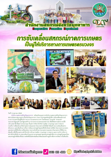 วันที่ 14 ตุลาคม 2568 สำนักงานสหกรณ์จังหวัดมุกดาหาร พร้อมด้วยบุคลากรสำนักงานสหกรณ์จังหวัดมุกดาหารสหกรณ์และกลุ่มเกษตรกรในจังหวัดมุกดาหาร ร่วมการประชุมเชิงปฏิบัติการขับเคลื่อนสหกรณ์ภาคการเกษตรเป็นผู้ให้บริการทางการเกษตรครบวงจร โดยร้อยเอก ธรรมนัส พรหมเผ่ารองนายกรัฐมนตรี และรัฐมนตรีว่าการกระทรวงเกษตรและสหกรณ์ เพื่อให้สหกรณ์สามารถให้บริการสมาชิกได้อย่างครอบคลุม ตั้งแต่การจัดหาปัจจัยการผลิต การแปรรูป และการตลาดรวมทั้งการเชื่อมโยงเครือข่ายสหกรณ์และสถาบันเกษตรกรในพื้นที่ เพื่อสร้างความเข้มแข็งอย่างเป็นระบบ แลพเพิ่มศักยภาพในการพัฒนาเศรษฐกิจชุมชนให้เติบโตอย่างยั่งยืน โดยกระทรวงเกษตรและสหกรณ์ได้มีนโยบายที่มุ่งเน้นการยกระดับศักยภาพเกษตรกรและสถาบันเกษตรกรให้มีความเข้มแข็ง เพื่อให้เกษตรกรเข้าถึงบริการด้านการผลิต การแปรรูป การตลาด และการบริการจัดการอย่างมีประสิทธิภาพ สอบคล้องกับแนวทางเกษตรมูลค่าสูงและเศรษฐกิจชีวภาพ เศรษฐกิจหมุนเวียนและเศรษฐกิจสีเขียวที่เน้นการผลิตที่เป็นมิตรต่อสิ่งแวดล้อมและสร้างมูลค่าเพิ่มจากทรัพยากรในท้องถิ่น