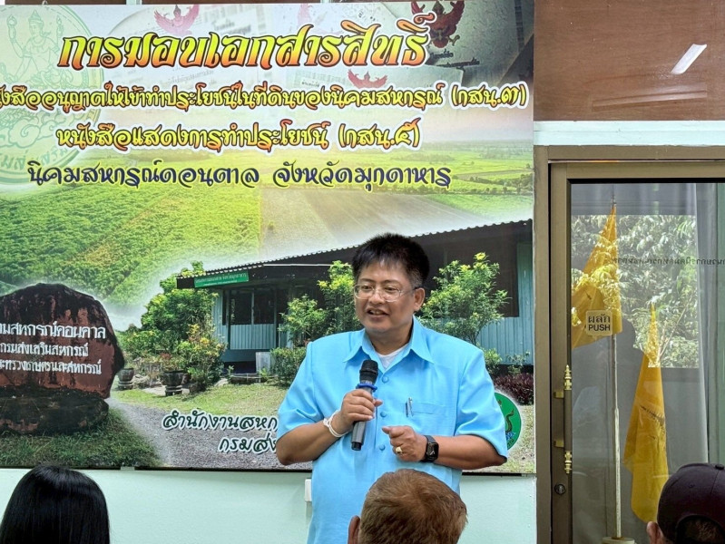 วันที่ 24 ตุลาคม 2568 นายพงศ์สันต์ ขำปู่ สหกรณ์จังหวัดมุกดาหาร ให้เกียรติมอบหนังสือแสดงการทำประโยชน์ (กสน.5) ให้แก่สมาชิกนิคมสหกรณ์ดอนตาล จำนวน 20 ราย 24 แปลง จำนวนเนื้อที่ 95– 3 – 71 ไร่ ทั้งนี้ สหกรณ์จังหวัดมุกดาหาร ได้ให้คำแนะนำให้สมาชิกผู้ได้รับหนังสือแสดงการทำประโยชน์ (กสน.5) ให้ดำเนินการยื่น ขอออกโฉนดที่ดิน ตามประมวลกฎหมายที่ดิน โดยผู้ยื่นคำขอนั้นต้องได้รับความเห็นชอบจากสหกรณ์ที่ตนเป็นสมาชิกอยู่ตามมาตรา 40 พระราชบัญญัติจัดที่ดินเพื่อการครองชีพ พ.ศ.2511 ณ นิคมสหกรณ์ดอนตาล จำกัด ตำบลดอนตาล อำเภอดอนตาล จังหวัดมุกดาหาร