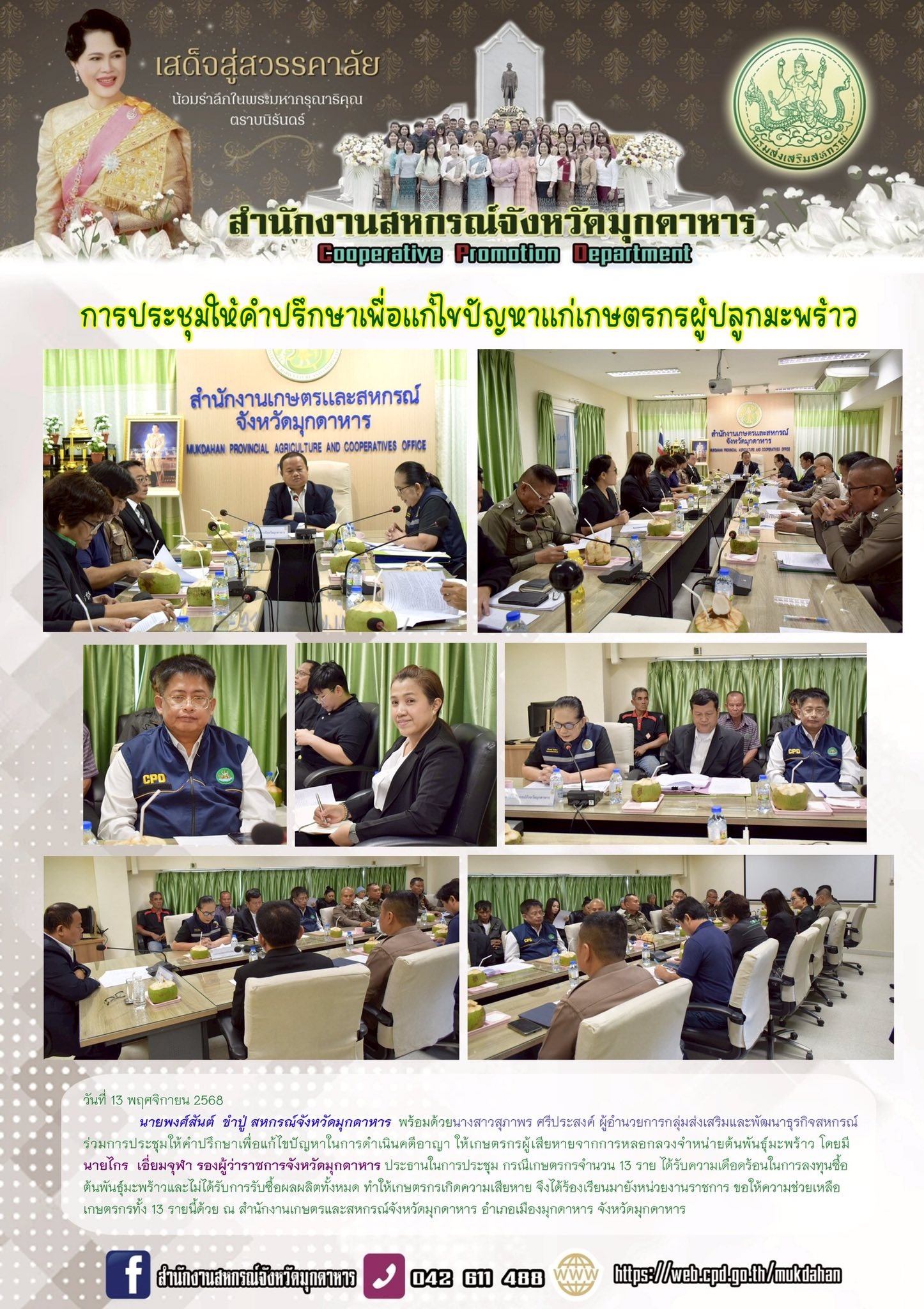 วันที่ 13 พฤศจิกายน 2568 นายพงศ์สันต์ ขำปู่ สหกรณ์จังหวัดมุกดาหาร พร้อมด้วยนางสาวสุภาพร ศรีประสงค์ ผู้อำนวยการกลุ่มส่งเสริมและพัฒนาธุรกิจสหกรณ์ ร่วมการประชุมให้คำปรึกษาเพื่อแก้ไขปัญหาในการดำเนินคดีอาญา ให้เกษตรกรผู้เสียหายจากการหลอกลวงจำหน่ายต้นพันธุ์มะพร้าว โดยมีนายไกร เอี่ยมจุฬา รองผู้ว่าราชการจังหวัดมุกดาหาร ประธานในการประชุม กรณีเกษตรกรจำนวน 13 ราย ได้รับความเดือดร้อนในการลงทุนซื้อต้นพันธุ์มะพร้าวและไม่ได้รับการรับซื้อผลผลิตทั้งหมด ทำให้เกษตรกรเกิดความเสียหาย จึงได้ร้องเรียนมายังหน่วยงานราชการ ขอให้ความช่วยเหลือเกษตรกรทั้ง 13 รายนี้ด้วย ณ สำนักงานเกษตรและสหกรณ์จังหวัดมุกดาหาร อำเภอเมืองมุกดาหาร จังหวัดมุกดาหาร