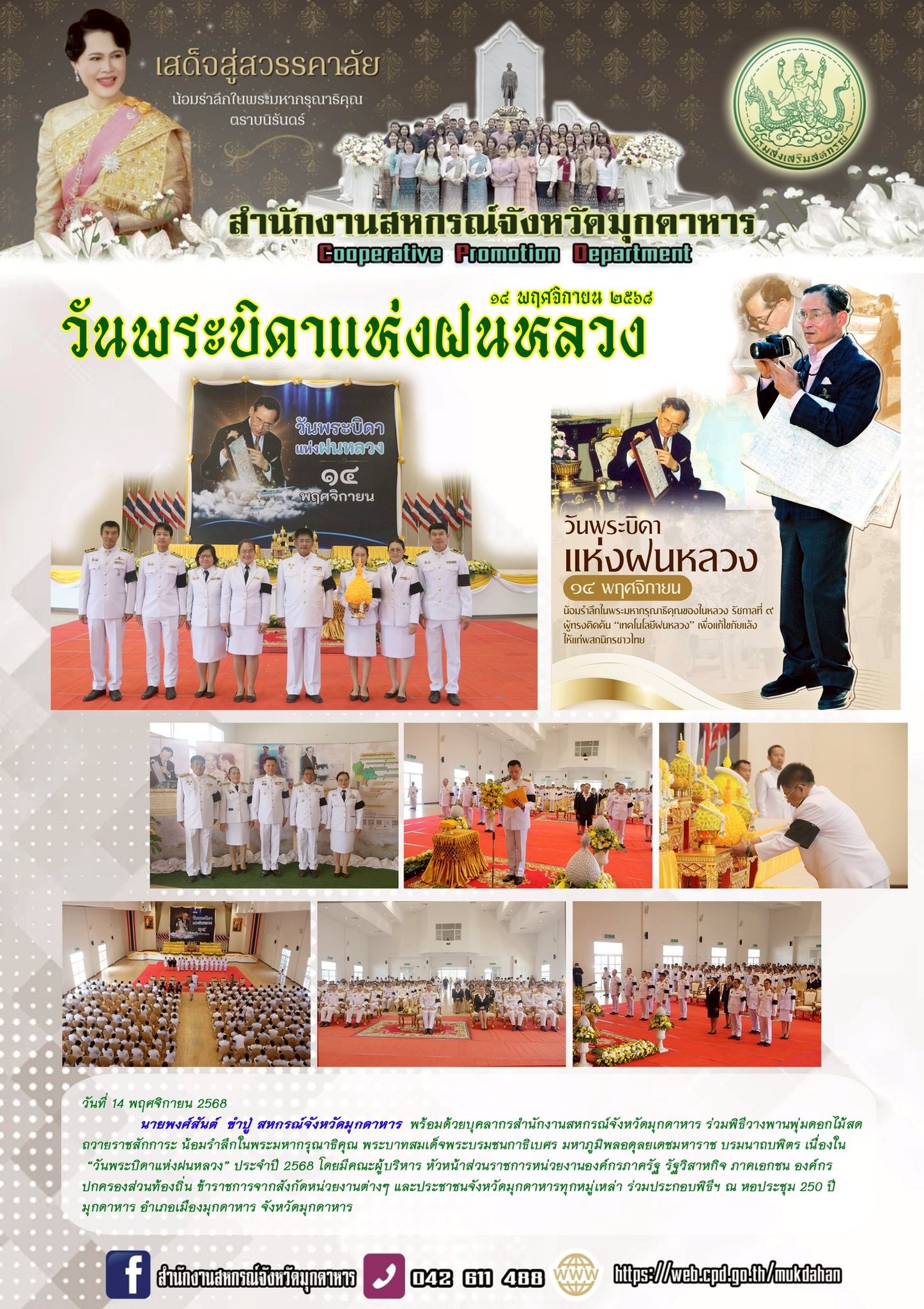 วันที่ 14 พฤศจิกายน 2568นายพงศ์สันต์ ขำปู่ สหกรณ์จังหวัดมุกดาหาร พร้อมด้วยบุคลากรสำนักงานสหกรณ์จังหวัดมุกดาหาร ร่วมพิธีวางพานพุ่มดอกไม้สดถวายราชสักการะ น้อมรำลึกในพระมหากรุณาธิคุณ พระบาทสมเด็จพระบรมชนกาธิเบศร มหาภูมิพลอดุลยเดชมหาราช บรมนาถบพิตร เนื่องใน “วันพระบิดาแห่งฝนหลวง” ประจำปี 2568 โดยมีคณะผู้บริหาร หัวหน้าส่วนราชการหน่วยงานองค์กรภาครัฐ รัฐวิสาหกิจ ภาคเอกชน องค์กรปกครองส่วนท้องถิ่น ข้าราชการจากสังกัดหน่วยงานต่างๆ และประชาชนจังหวัดมุกดาหารทุกหมู่เหล่า