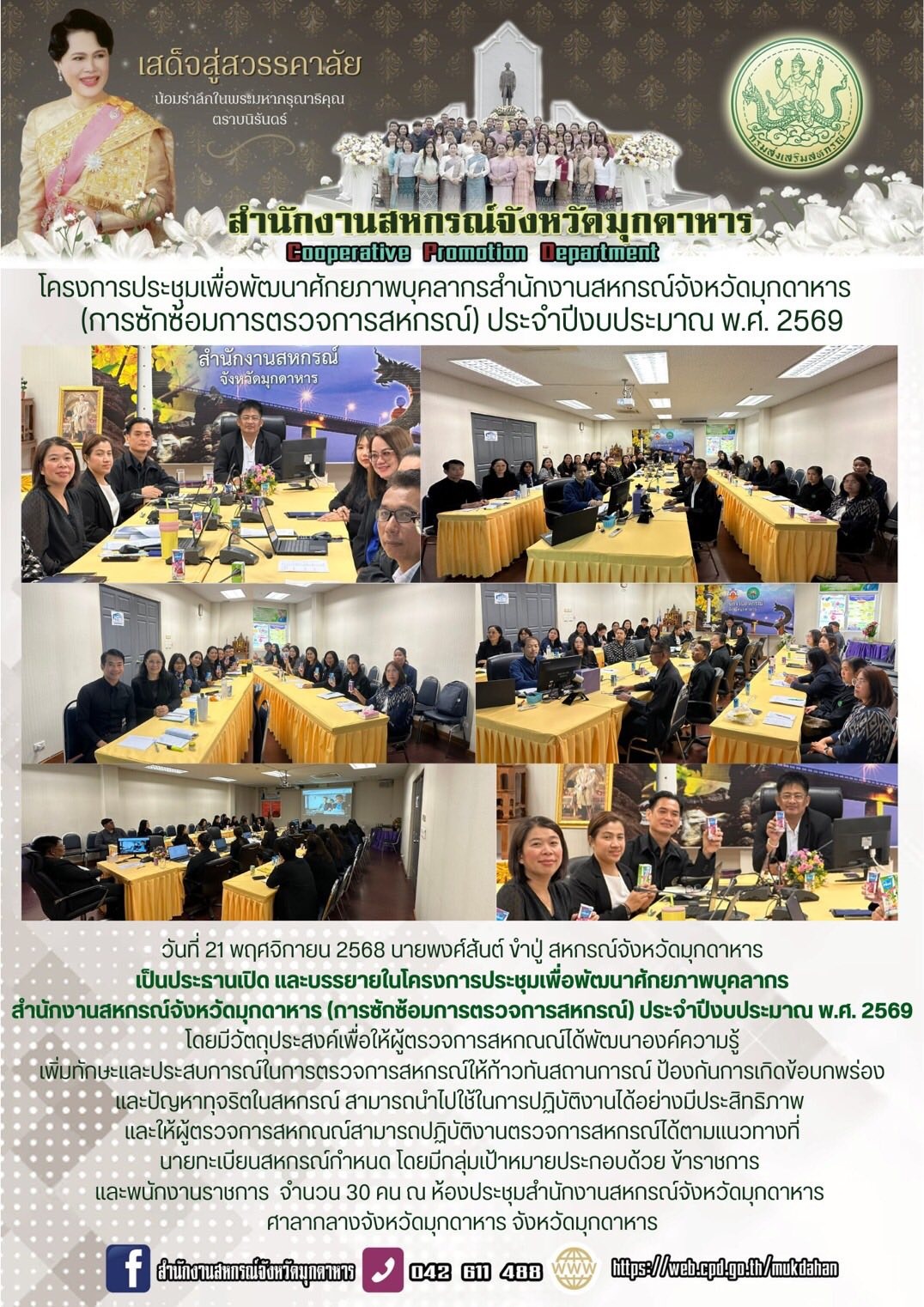 วันที่ 21 พฤศจิกายน 2568 นายพงศ์สันต์ ขำปู่ สหกรณ์จังหวัดมุกดาหาร เป็นประธานเปิด และบรรยายในโครงการประชุมเพื่อพัฒนาศักยภาพบุคลากร สำนักงานสหกรณ์จังหวัดมุกดาหาร (การซักซ้อมการตรวจการสหกรณ์) ประจำปีงบประมาณ พ.ศ. 2569 โดยมีวัตถุประสงค์เพื่อให้ผู้ตรวจการสหกณณ์ได้พัฒนาองค์ความรู้เพิ่มทักษะและประสบการณ์ในการตรวจการสหกรณ์ให้ก้าวทันสถานการณ์ ป้องกันการเกิดข้อบกพร่องและปัญหาทุจริตในสหกรณ์ สามารถนำไปใช้ในการปฏิบัติงานได้อย่างมีประสิทธิภาพ และให้ผู้ตรวจการสหกณณ์สามารถปฏิบัติงานตรวจการสหกรณ์ได้ตามแนวทางที่นายทะเบียนสหกรณ์กำหนด โดยมีกลุ่มเป้าหมายประกอบด้วย ข้าราชการ และพนักงานราชการ จำนวน 30 คน ณ ห้องประชุมสำนักงานสหกรณ์จังหวัดมุกดาหาร ศาลากลางจังหวัดมุกดาหาร จังหวัดมุกดาหาร