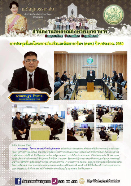 วันที่ 4 ธันวาคม 2568 นายเชษฐา ไพศาล สหกรณ์จังหวัดมุกดาหาร พร้อมด้วยนางสาวสุภาพร ศรีประสงค์ ผู้อำนวยการกลุ่มส่งเสริมและพัฒนาธุรกิจสหกรณ์และคณะร่วมการประชุมชี้แจงโครงการส่งเสริมและพัฒนาอาชีพเพื่อแก้ไขปัญหาที่ดินทำกินของเกษตรกร ภายใต้โครงการจัดที่ดินทำกินให้ชุมชนตามนโยบายรัฐบาล (คทช.) ประจำปีงบประมาณ พ.ศ. 2569 โดยนายประวัติ แดงบรรจง รองอธิบดีกรมส่งเสริมสหกรณ์ เป็นประธานในพิธีเปิด นายบรรจง ชัยขุนพล ผู้อำนวยการกองพัฒนาระบบสนับสนุนการสหกรณ์ นายวัชระ กวีศรีเดชา ผู้เชี่ยวชาญด้านการส่งเสริมงานสหกรณ์ นางสาวอรวรรณ รอดหลง ผู้อำนวยการกลุ่มขับเคลื่อนการส่งเสริมพัฒนาอาชีพและการตลาด ตามนโยบายคณะกรรมการนโยบายที่ดินแห่งชาติ และเจ้าหน้าที่ที่เกี่ยวข้อง เข้าร่วมประชุมผ่านระบบ Zoom Meeting ณ สำนักงานสหกรณ์จังหวัดมุกดาหาร อำเภอเมืองมุกดาหาร จังหวัดมุกดาหาร