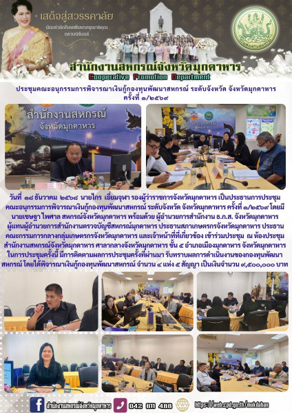 วันที่ 18 ธันวาคม 2568 นายไกร เอี่ยมจุฬา รองผู้ว่าราชการจังหวัดมุกดาหาร เป็นประธานการประชุมคณะอนุกรรมการพิจารณาเงินกู้กองทุนพัฒนาสหกรณ์ ระดับจังหวัด จังหวัดมุกดาหาร ครั้งที่ 1/2569 โดยมี นายเชษฐา ไพศาล สหกรณ์จังหวัดมุกดาหาร พร้อมด้วย ผู้อำนวยการสำนักงาน ธ.ก.ส. จังหวัดมุกดาหาร ผู้แทนผู้อำนวยการสำนักงานตรวจบัญชีสหกรณ์มุกดาหาร ประธานสภาเกษตรกรจังหวัดมุกดาหาร ประธานคณะกรรมการกลางกลุ่มเกษตรกรจังหวัดมุกดาหาร และเจ้าหน้าที่ที่เกี่ยวข้อง เข้าร่วมประชุม ณ ห้องประชุมสำนักงานสหกรณ์จังหวัดมุกดาหาร ศาลากลางจังหวัดมุกดาหาร ชั้น 5 อำเภอเมืองมุกดาหาร จังหวัดมุกดาหาร ในการประชุมครั้งนี้ มีการติดตามผลการประชุมครั้งที่ผ่านมา รับทราบผลการดำเนินงานของกองทุนพัฒนาสหกรณ์ โดยได้พิจารณาเงินกู้กองทุนพัฒนาสหกรณ์ จำนวน ๔ แห่ง ๕ สัญญา เป็นเงินจำนวน 9,500,000 บาท