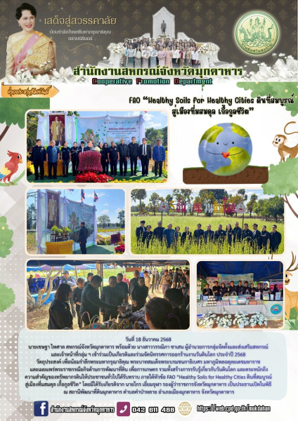 วันที่ 18 ธันวาคม 2568 นายเชษฐา ไพศาล สหกรณ์จังหวัดมุกดาหาร พร้อมด้วย นางสาววรรณิภา ซาเสน ผู้อำนวยการกลุ่มจัดตั้งและส่งเสริมสหกรณ์ และเจ้าหน้าที่กลุ่ม ฯ เข้าร่วมเป็นเกียรติและร่วมจัดนิทรรศการออกร้านงานวันดินโลก ประจำปี 2568 วัตถุประสงค์ เพื่อน้อมรำลึกพระมหากรุณาธิคุณ พระบาทสมเด็จพระบรมชนกาธิเบศร มหาภูมิพลอดุลยเดชมหาราช และเผยแพร่พระราชกรณียกิจด้านการพัฒนาที่ดิน เพื่อการเกษตร รวมทั้งสร้างการรรับรู้เกี่ยวกับวันดินโลก และตระหนักถึงความสำคัญของทรัพยากรดินให้ประชาชนทั่วไปได้รับทราบ ภายใต้หัวข้อ FAO “Healthy Soils for Healthy Cities ดินที่สมบูรณ์ สู่เมืองที่มสมดุล เกื้อกูลชีวิต”โดยมีได้รับเกียรติจาก นายไกร เอี่ยมจุฬา รองผู้ว่าราชการจังหวัดมุกดาหาร เป็นประธานเปิดในพิธี ณ สถานีพัฒนาที่ดินมุกดาหาร ตำบลคำป่าหลาย อำเภอเมืองมุกดาหาร จังหวัดมุกดาหาร