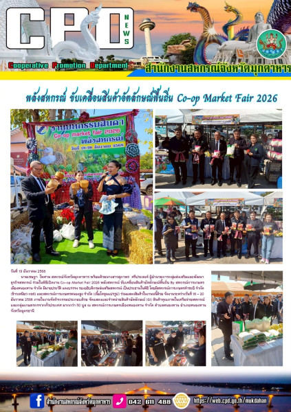 วันที่ 19 ธันวาคม 2568 นายเชษฐา ไพศาล สหกรณ์จังหวัดมุกดาหาร พร้อมด้วยนางสาวสุภาพร ศรีประสงค์ ผู้อำนวยการกลุ่มส่งเสริมและพัฒนาธุรกิจสหกรณ์ ร่วมในพิธีเปิดงาน Co-op Market Fair 2026 พลังสหกรณ์ ขับเคลื่อนสินค้าอัตลักษณ์พื้นถิ่น By สหกรณ์การเกษตรเมืองหนองหาน จำกัด มีนายประวัติ แดงบรรจง รองอธิบดีกรมส่งเสริมสหกรณ์ เป็นประธานในพิธี โดยมีสหกรณ์การเกษตรคำชะอี จำกัด(ข้าวเหนียว กข6) และสหกรณ์การเกษตรหนองสูง จำกัด (เนื้อโคขุนแปรรูป) ร่วมแสดงสินค้าในงานนนี้ด้วย จัดงานระหว่างวันที่ 18 - 20 ธันวาคม 2568 ภายในงานจัดกิจกรรมประกอบด้วย จัดแสดงและจำหน่ายสินค้าอัตลักษณ์ (GI) สินค้าคุณภาพในเครือข่ายสหกรณ์และกลุ่มเกษตรกรจากทั่วประเทศ มากกว่า 30 บูธ ณ สหกรณ์การเกษตรเมืองหนองหาน จำกัด ตำบลหนองหาน อำเภอหนองหาน จังหวัดอุดรธานี