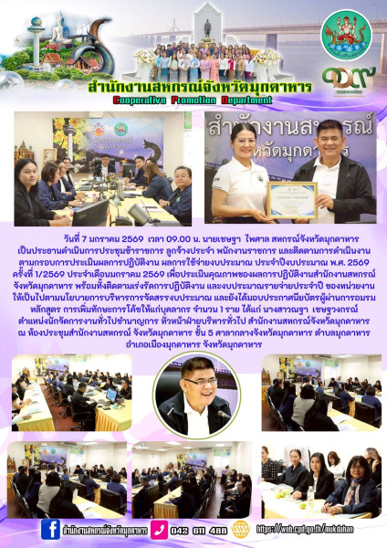 วันที่ 7 มกราคม 2569 เวลา 09.00 น. นายเชษฐา ไพศาล สหกรณ์จังหวัดมุกดาหาร เป็นประธานดำเนินการประชุมข้าราชการ ลูกจ้างประจำ พนักงานราชการ และติดตามการดำเนินงานตามกรอบการประเมินผลการปฏิบัติงาน ผลการใช้จ่ายงบประมาณ ประจำปีงบประมาณ พ.ศ. 2569 ครั้งที่ 1/2569 ประจำเดือนมกราคม 2569 เพื่อประเมินคุณภาพของผลการปฏิบัติงานสำนักงานสหกรณ์จังหวัดมุกดาหารพร้อมทั้งติดตามเร่งรัดการปฏิบัติงาน และงบประมาณรายจ่ายประจำปี ของหน่วยงาน ให้เป็นไปตามนโยบายการบริหารการจัดสรรงบประมาณ และยังได้มอบประกาศนียบัตรผู้ผ่านการอมรม หลักสูตร การเพิ่มทักษะการโค้ชให้แก่บุคลากร จำนวน 1 ราย ได้แก่ นางสาวณฐา เชษฐวงกรณ์ ตำแหน่งนักจัดการงานทั่วไปชำนาญการ หัวหน้าฝ่ายบริหารทั่วไป สำนักงานสหกรณ์จังหวัดมุกดาหาร ณ ห้องประชุมสำนักงานสหกรณ์ จังหวัดมุกดาหาร ชั้น 5 ศาลากลางจังหวัดมุกดาหาร ตำบลมุกดาหารอำเภอเมืองมุกดาหาร จังหวัดมุกดาหาร