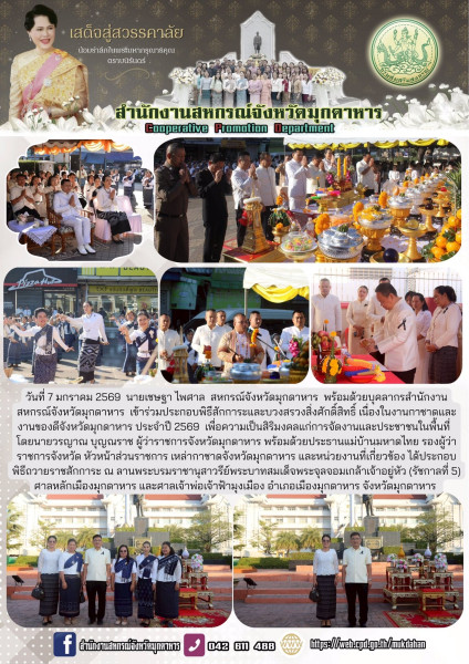 วันที่ 7 มกราคม 2569 นายเชษฐา ไพศาล สหกรณ์จังหวัดมุกดาหาร พร้อมด้วยบุคลากรสำนักงานสหกรณ์จังหวัดมุกดาหาร เข้าร่วมประกอบพิธีสักการะและบวงสรวงสิ่งศักดิ์สิทธิ์ เนื่องในงานกาชาดและงานของดีจังหวัดมุกดาหาร ประจำปี 2569 เพื่อความเป็นสิริมงคลแก่การจัดงานและประชาชนในพื้นที่ โดยนายวรญาณ บุญณราช ผู้ว่าราชการจังหวัดมุกดาหาร พร้อมด้วยประธานแม่บ้านมหาดไทย รองผู้ว่าราชการจังหวัด หัวหน้าส่วนราชการ เหล่ากาชาดจังหวัดมุกดาหาร และหน่วยงานที่เกี่ยวข้อง ได้ประกอบพิธีถวายราชสักการะ ณ ลานพระบรมราชานุสาวรีย์พระบาทสมเด็จพระจุลจอมเกล้าเจ้าอยู่หัว (รัชกาลที่ 5) ศาลหลักเมืองมุกดาหาร และศาลเจ้าพ่อเจ้าฟ้ามุงเมือง อำเภอเมืองมุกดาหาร จังหวัดมุกดาหาร