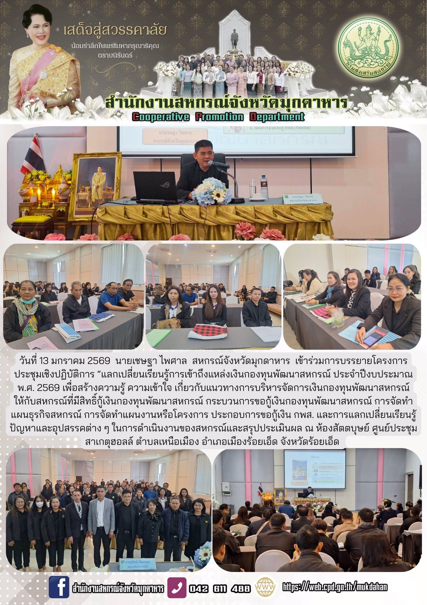 วันที่ 13 มกราคม 2569 นายเชษฐา ไพศาล สหกรณ์จังหวัดมุกดาหาร เข้าร่วมการบรรยายโครงการประชุมเชิงปฏิบัติการ “แลกเปลี่ยนเรียนรู้การเข้าถึงแหล่งเงินกองทุนพัฒนาสหกรณ์ ประจำปีงบประมาณ พ.ศ. 2569 เพื่อสร้างความรู้ ความเข้าใจ เกี่ยวกับแนวทางการบริหารจัดการเงินกองทุนพัฒนาสหกรณ์ให้กับสหกรณ์ที่มีสิทธิ์กู้เงินกองทุนพัฒนาสหกรณ์ กระบวนการขอกู้เงินกองทุนพัฒนาสหกรณ์ การจัดทำแผนธุรกิจสหกรณ์ การจัดทำแผนงานหรือโครงการ ประกอบการขอกู้เงิน กพส. และการแลกเปลี่ยนเรียนรู้ปัญหาและอุปสรรคต่าง ๆ ในการดำเนินงานของสหกรณ์และสรุปประเมินผล ณ ห้องสัตตบุษย์ ศูนย์ประชุมสาเกตุฮอลล์ ตำบลเหนือเมือง อำเภอเมืองร้อยเอ็ด จังหวัดร้อยเอ็ด