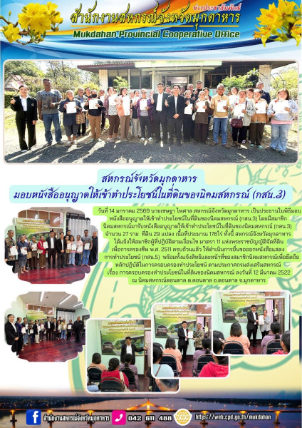 วันที่ 14 มกราคม 2569 นายเชษฐา ไพศาล สหกรณ์จังหวัดมุกดาหาร เป็นประธานในพิธีมอบหนังสืออนุญาตให้เข้าทำประโยชน์ในที่ดินของนิคมสหกรณ์ (กสน.3) โดยมีสมาชิกนิคมสหกรณ์มารับหนังสืออนุญาตให้เข้าทำประโยชน์ในที่ดินของนิคมสหกรณ์ (กสน.3) จำนวน 27 ราย ที่ดิน 29 แปลง เนื้อที่ประมาณ 176ไร่ ทั้งนี้ สหกรณ์จังหวัดมุกดาหาร ได้แจ้งให้สมาชิกผู้ที่ปฏิบัติตามเงื่อนไข มาตรา 11 แห่งพระราชบัญญัติจัดที่ดินเพื่อการครองชีพ พ.ศ. 2511 ครบถ้วนแล้ว ให้ดำเนินการยื่นขอออกหนังสือแสดงการทำประโยชน์ (กสน.5) พร้อมทั้งแจ้งสิทธิและหน้าที่ของสมาชิกนิคมสหกรณ์เพื่อยึดถือหลักปฏิบัติในการครอบครองทำประโยชน์ ตามประกาศกรมส่งเสริมสหกรณ์ เรื่อง การครอบครองทำประโยชน์ในที่ดินของนิคมสหกรณ์ ลงวันที่ 12 มีนาคม 2522 ณ นิคมสหกรณ์ดอนตาล ต.ดอนตาล อ.ดอนตาล จ.มุกดาหาร