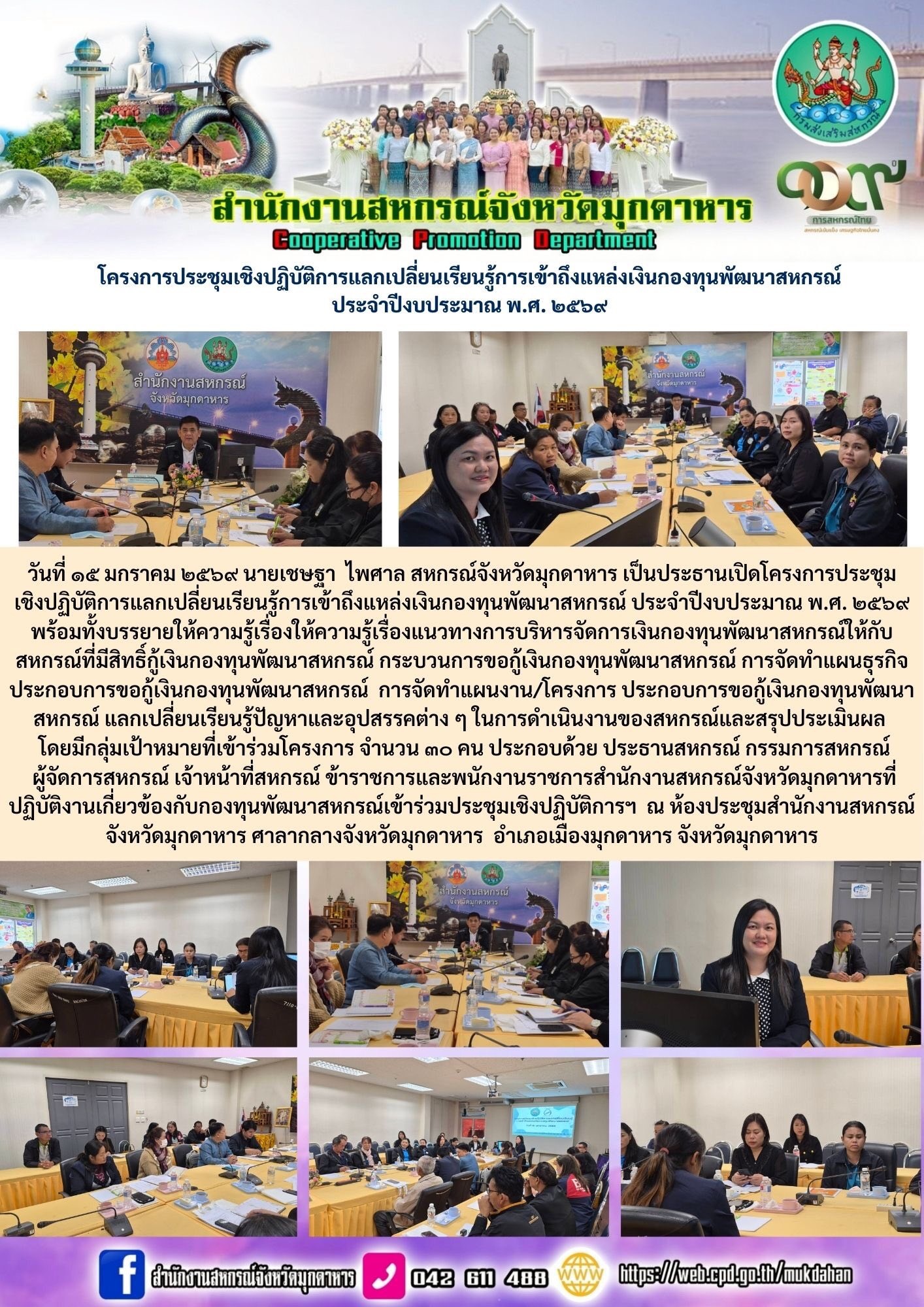 วันที่ 15มกราคม 2569 นายเชษฐา ไพศาล สหกรณ์จังหวัดมุกดาหาร เป็นประธานเปิดโครงการประชุมเชิงปฏิบัติการแลกเปลี่ยนเรียนรู้การเข้าถึงแหล่งเงินกองทุนพัฒนาสหกรณ์ ประจำปีงบประมาณ พ.ศ. 2569 พร้อมทั้งบรรยายให้ความรู้เรื่องให้ความรู้เรื่องแนวทางการบริหารจัดการเงินกองทุนพัฒนาสหกรณ์ให้กับสหกรณ์ที่มีสิทธิ์กู้เงินกองทุนพัฒนาสหกรณ์ กระบวนการขอกู้เงินกองทุนพัฒนาสหกรณ์ การจัดทำแผนธุรกิจ ประกอบการขอกู้เงินกองทุนพัฒนาสหกรณ์ การจัดทำแผนงาน/โครงการ ประกอบการขอกู้เงินกองทุนพัฒนาสหกรณ์ แลกเปลี่ยนเรียนรู้ปัญหาและอุปสรรคต่าง ๆ ในการดำเนินงานของสหกรณ์และสรุปประเมินผล โดยมีกลุ่มเป้าหมายที่เข้าร่วมโครงการ จำนวน ๓๐ คน ประกอบด้วย ประธานสหกรณ์ กรรมการสหกรณ์ ผู้จัดการสหกรณ์ เจ้าหน้าที่สหกรณ์ ข้าราชการและพนักงานราชการสำนักงานสหกรณ์จังหวัดมุกดาหารที่ปฏิบัติงานเกี่ยวข้องกับกองทุนพัฒนาสหกรณ์เข้าร่วมประชุมเชิงปฏิบัติการฯ ณ ห้องประชุมสำนักงานสหกรณ์จังหวัดมุกดาหาร ศาลากลางจังหวัดมุกดาหาร อำเภอเมืองมุกดาหาร จังหวัดมุกดาหาร