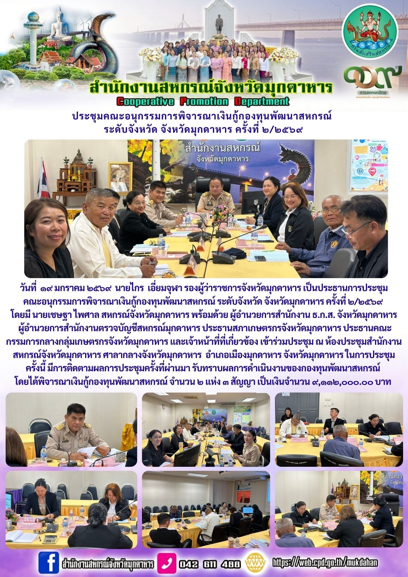 วันที่ 19 มกราคม 2569 นายไกร เอี่ยมจุฬา รองผู้ว่าราชการจังหวัดมุกดาหาร เป็นประธานการประชุมคณะอนุกรรมการพิจารณาเงินกู้กองทุนพัฒนาสหกรณ์ ระดับจังหวัด จังหวัดมุกดาหาร ครั้งที่ 2/2569 โดยมี นายเชษฐา ไพศาล สหกรณ์จังหวัดมุกดาหาร พร้อมด้วย ผู้อำนวยการสำนักงาน ธ.ก.ส. จังหวัดมุกดาหาร ผู้อำนวยการสำนักงานตรวจบัญชีสหกรณ์มุกดาหาร ประธานสภาเกษตรกรจังหวัดมุกดาหาร ประธานคณะกรรมการกลางกลุ่มเกษตรกรจังหวัดมุกดาหาร และเจ้าหน้าที่ที่เกี่ยวข้อง เข้าร่วมประชุม ณ ห้องประชุมสำนักงานสหกรณ์จังหวัดมุกดาหาร ศาลากลางจังหวัดมุกดาหาร อำเภอเมืองมุกดาหาร จังหวัดมุกดาหาร ในการประชุมครั้งนี้ มีการติดตามผลการประชุมครั้งที่ผ่านมา รับทราบผลการดำเนินงานของกองทุนพัฒนาสหกรณ์ โดยได้พิจารณาเงินกู้กองทุนพัฒนาสหกรณ์ จำนวน ๒ แห่ง ๓ สัญญา เป็นเงินจำนวน 9,112,000.00 บาท