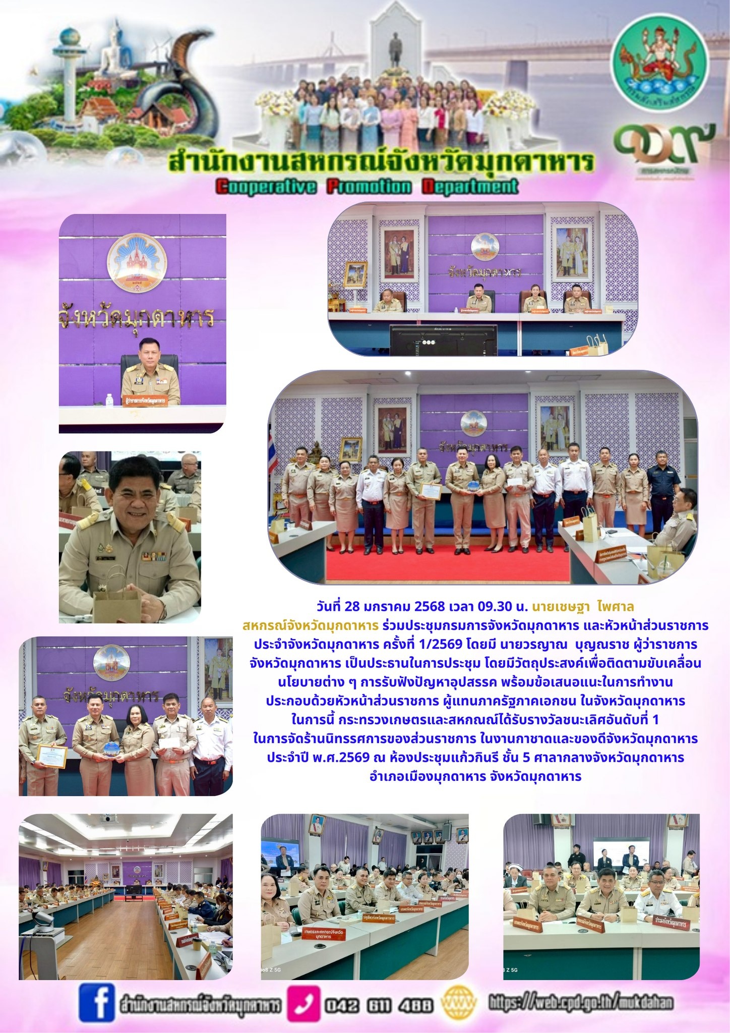 วันที่ 28 มกราคม 2568 เวลา 09.30 น. นายเชษฐา ไพศาล สหกรณ์จังหวัดมุกดาหาร ร่วมประชุมกรมการจังหวัดมุกดาหาร และหัวหน้าส่วนราชการ ประจำจังหวัดมุกดาหาร ครั้งที่ 1/2569 โดยมี นายวรญาณ บุญณราช ผู้ว่าราชการจังหวัดมุกดาหาร เป็นประธานในการประชุม โดยมีวัตถุประสงค์ เพื่อติดตามขับเคลื่อนนโยบายต่างๆ การรับฟังปัญหาอุปสรรค พร้อมข้อเสนอแนะในการทำงานประกอบด้วยหัวหน้าส่วนราชการ ผู้แทนภาครัฐภาคเอกชนในจังหวัดมุกดาหาร ในการนี้ กระทรวงเกษตรและสหกณณ์ ได้รับรางวัลชนะเลิศ อันดับที่ 1 ในการจัดร้านนิทรรศการของส่วนราชการ ในงานกาชาดและของดีจังหวัดมุกดาหาร ประจำปี พ.ศ. 2569 ณ ห้องประชุมแก้วกินรี ชั้น 5 ศาลากลางจังหวัดมุกดาหาร อำเภอเมืองมุกดาหาร จังหวัดมุกดาหาร