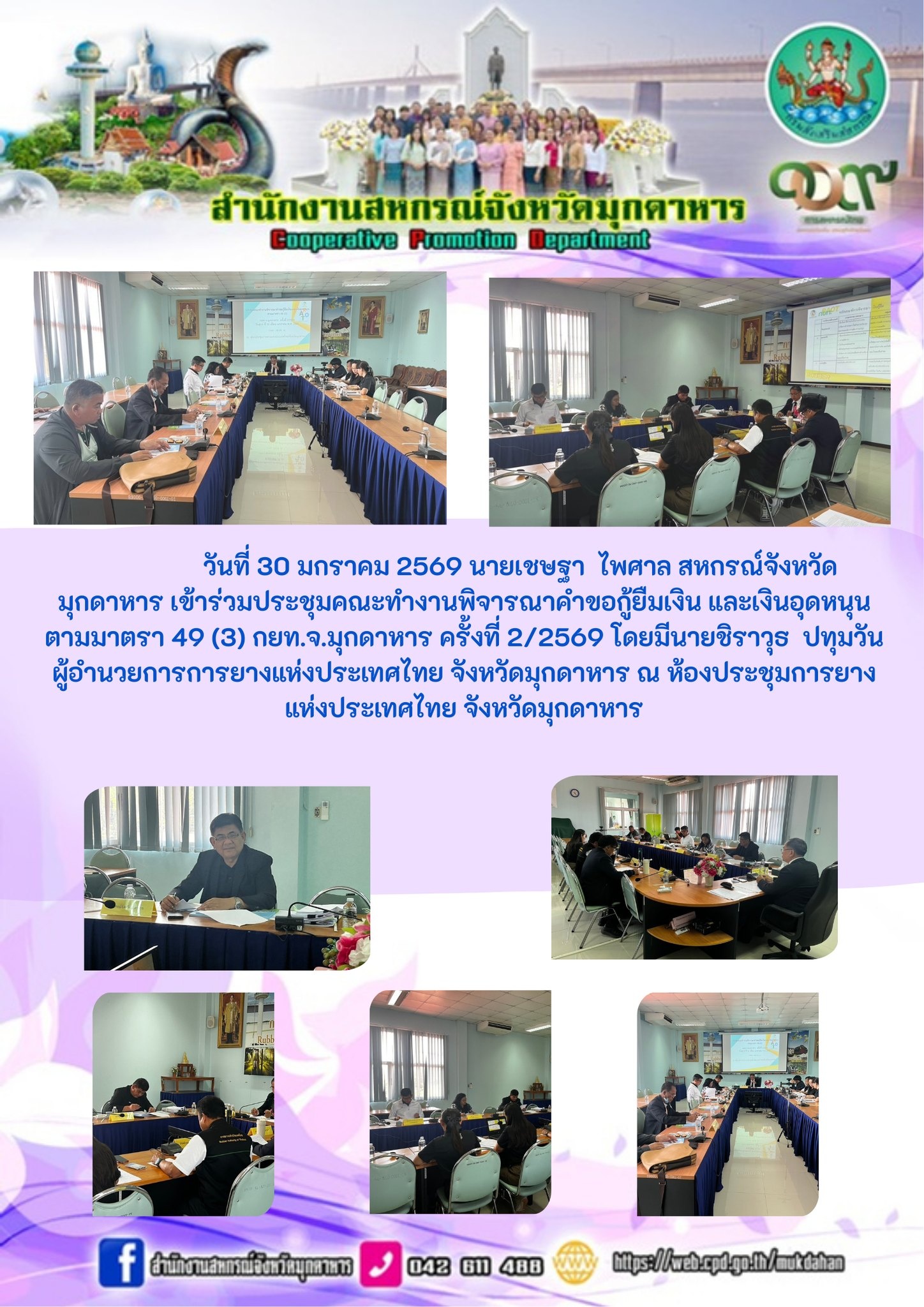 วันที่ 30 มกราคม 2569 นายเชษฐา ไพศาล สหกรณ์จังหวัดมุกดาหาร เข้าร่วมประชุมคณะทำงานพิจารณาคำขอกู้ยืมเงิน และเงินอุดหนุน ตามมาตรา 49 (3) กยท.จ.มุกดาหาร ครั้งที่ 2/2569 โดยมีนายชิราวุธ ปทุมวัน ผู้อำนวยการการยางแห่งประเทศไทย จังหวัดมุกดาหาร ณ ห้องประชุมการยางแห่งประเทศไทย จังหวัดมุกดาหาร