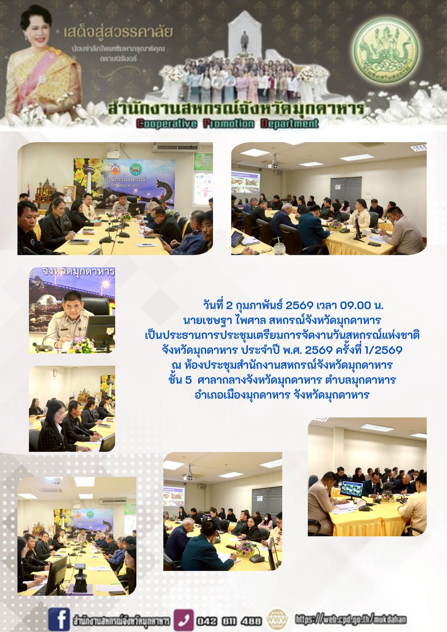 วันที่ 2 กุมภาพันธ์ 2569 เวลา 09.00 น. นายเชษฐา ไพศาล สหกรณ์จังหวัดมุกดาหาร เป็นประธานการประชุมเตรียมการจัดงานวันสหกรณ์แห่งชาติจังหวัดมุกดาหาร ประจำปี พ.ศ. 2569 ครั้งที่ 1/2569 ณ ห้องประชุมสำนักงานสหกรณ์จังหวัดมุกดาหาร ชั้น 5 ศาลากลางจังหวัดมุกดาหาร ตำบลมุกดาหาร อำเภอเมืองมุกดาหาร จังหวัดมุกดาหาร
