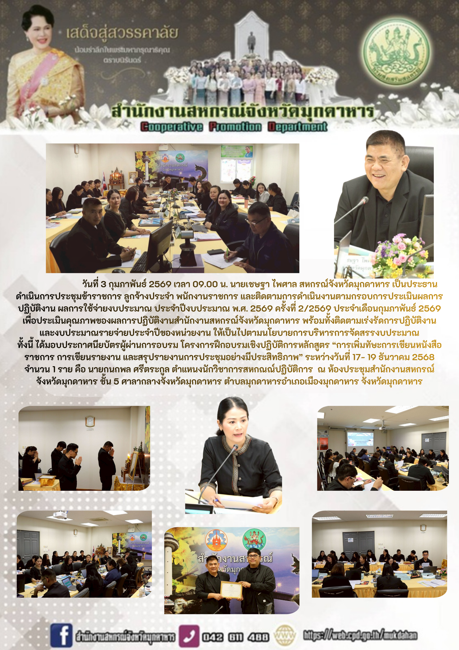 วันที่ 3 กุมภาพันธ์ 2569 เวลา 09.00 น. นายเชษฐา ไพศาล สหกรณ์จังหวัดมุกดาหาร เป็นประธานดำเนินการประชุมข้าราชการ ลูกจ้างประจำ พนักงานราชการ และติดตามการดำเนินงานตามกรอบการประเมินผลการปฏิบัติงาน ผลการใช้จ่ายงบประมาณ ประจำปีงบประมาณ พ.ศ. 2569 ครั้งที่ 2/2569 ประจำเดือนกุมภาพันธ์ 2569 เพื่อประเมินคุณภาพของผลการปฏิบัติงานสำนักงานสหกรณ์จังหวัดมุกดาหาร พร้อมทั้งติดตามเร่งรัดการปฏิบัติงาน และงบประมาณรายจ่ายประจำปีของหน่วยงาน ให้เป็นไปตามนโยบายการบริหารการจัดสรรงบประมาณ ทั้งนี้ ได้มอบประกาศนียบัตรผู้ผ่านการอบรม โครงการฝึกอบรมเชิงปฏิบัติการหลักสูตร “การเพิ่มทัษะการเขียนหนังสือราชการ การเขียนรายงาน และสรุปรายงานการประชุมอย่างมีประสิทธิภาพ” ระหว่างวันที่ 17- 19 ธันวาคม 2568 จำนวน 1 ราย คือ นายกนกพล ศรีตระกูล ตำแหนงนักวิชาการสหกณณ์ปฏิบัติการ ณ ห้องประชุมสำนักงานสหกรณ์ จังหวัดมุกดาหาร ชั้น 5 ศาลากลางจังหวัดมุกดาหาร ตำบลมุกดาหารอำเภอเมืองมุกดาหาร จังหวัดมุกดาหาร