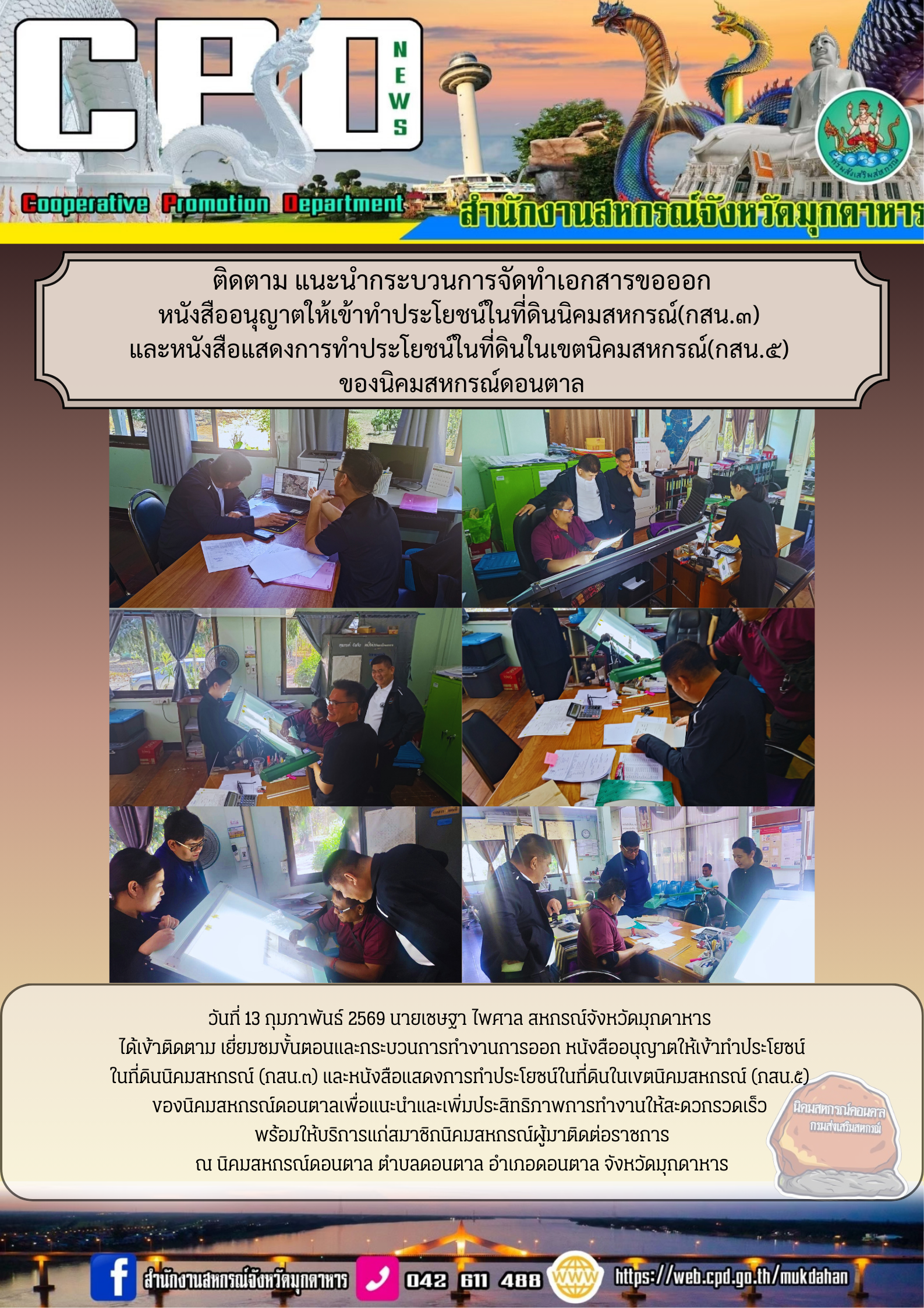 วันที่ 13 กุมภาพันธ์ 2569 นายเชษฐา ไพศาล สหกรณ์จังหวัดมุกดาหาร ได้เข้าติดตาม เยี่ยมชมขั้นตอนและกระบวนการทำงานการออก หนังสืออนุญาตให้เข้าทำประโยชน์ในที่ดินนิคมสหกรณ์ (กสน.๓) และหนังสือแสดงการทำประโยชน์ในที่ดินในเขตนิคมสหกรณ์ (กสน.๕) ของนิคมสหกรณ์ดอนตาลเพื่อแนะนำและเพิ่มประสิทธิภาพการทำงานให้สะดวกรวดเร็ว พร้อมให้บริการแก่สมาชิกนิคมสหกรณ์ผู้มาติดต่อราชการ ณ นิคมสหกรณ์ดอนตาล ตำบลดอนตาล อำเภอดอนตาล จังหวัดมุกดาหาร