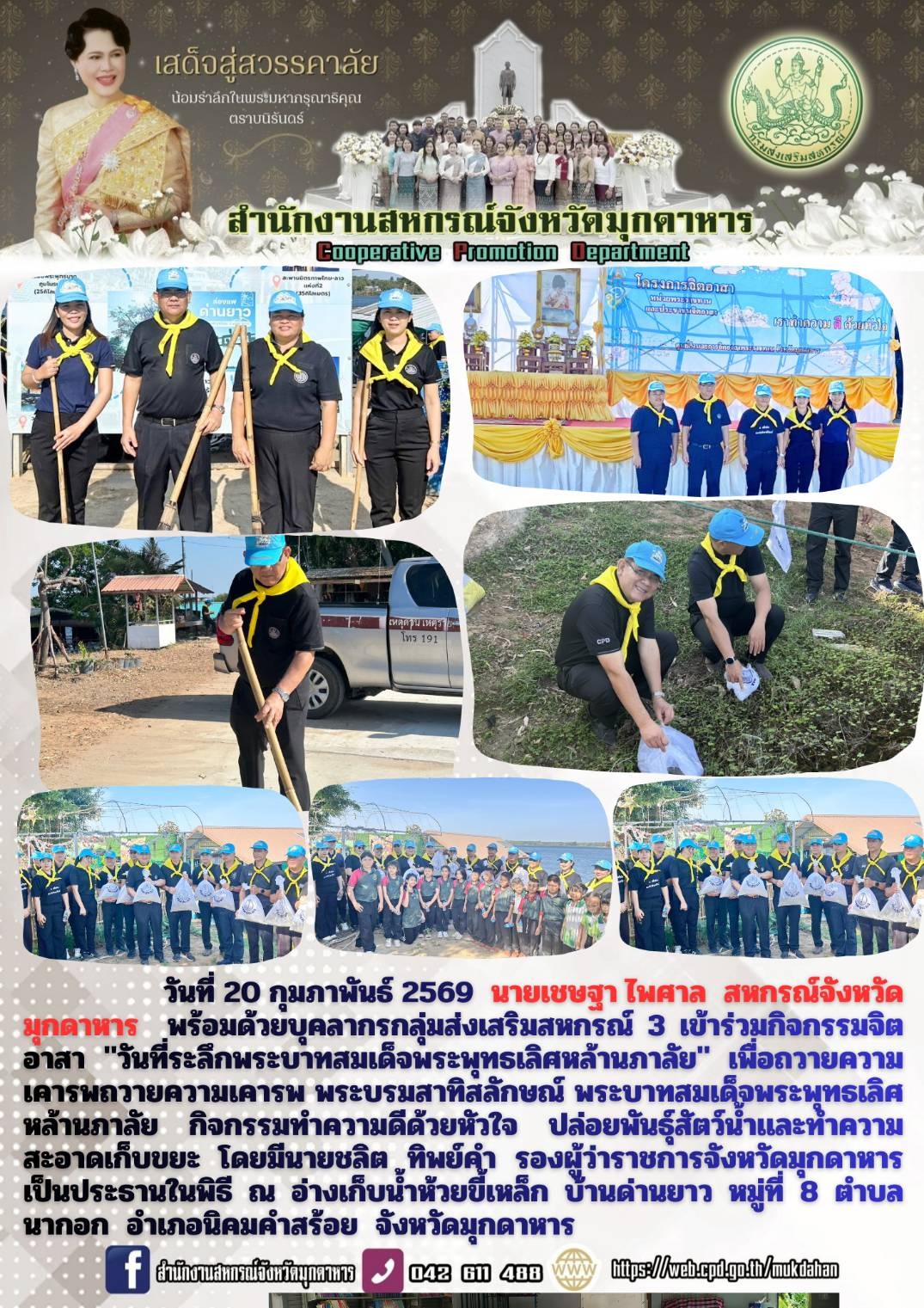 วันที่ 20 กุมภาพันธ์ 2569 นายเชษฐา ไพศาล สหกรณ์จังหวัดมุกดาหาร พร้อมด้วยบุคลากรกลุ่มส่งเสริมสหกรณ์ 3 เข้าร่วมกิจกรรมจิตอาสา "วันที่ระลึกพระบาทสมเด็จพระพุทธเลิศหล้านภาลัย" เพื่อถวายความเคารพถวายความเคารพ พระบรมสาทิสลักษณ์ พระบาทสมเด็จพระพุทธเลิศหล้านภาลัย กิจกรรมทำความดีด้วยหัวใจ ปล่อยพันธุ์สัตว์น้ำ เเละทำความสะอาดเก็บขยะ โดยมีนายชลิต ทิพย์คำ รองผู้ว่าราชการจังหวัดมุกดาหารเป็นประธานในพิธี ณ อ่างเก็บน้ำห้วยขี้เหล็ก บ้านด่านยาวหมู่ที่ 8 ตำบลนากอก อำเภอนิคมคำสร้อย จังหวัดมุกดาหาร