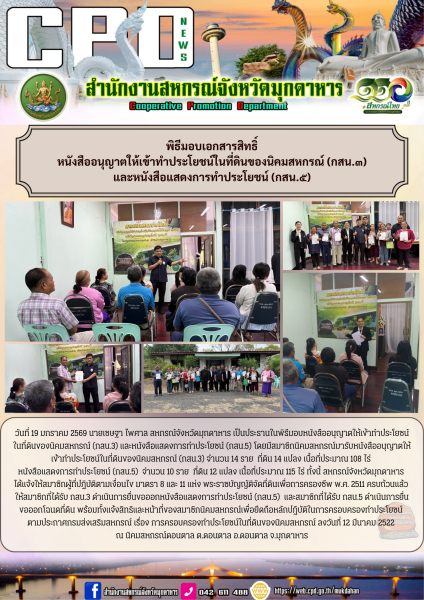 วันที่ 19 มกราคม 2569 นายเชษฐา ไพศาล สหกรณ์จังหวัดมุกดาหาร เป็นประธานในพิธีมอบหนังสืออนุญาตให้เข้าทำประโยชน์ในที่ดินของนิคมสหกรณ์ (กสน.3) และหนังสือแสดงการทำประโยชน์ (กสน.5) โดยมีสมาชิกนิคมสหกรณ์มารับหนังสืออนุญาตให้เข้าทำประโยชน์ในที่ดินของนิคมสหกรณ์ (กสน.3) จำนวน 14 ราย ที่ดิน 14 แปลง เนื้อที่ประมาณ 108 ไร่ หนังสือแสดงการทำประโยชน์ (กสน.5) จำนวน 10 ราย ที่ดิน 12 แปลง เนื้อที่ประมาณ 115 ไร่ ทั้งนี้ สหกรณ์จังหวัดมุกดาหาร ได้แจ้งให้สมาชิกผู้ที่ปฏิบัติตามเงื่อนไข มาตรา 11 แห่ง พระราชบัญญัติจัดที่ดินเพื่อการครองชีพ พ.ศ. 2511 ครบถ้วนแล้ว ให้สมาชิกที่ได้รับ กสน.3 ดำเนินการยื่นขอออกหนังสือแสดงการทำประโยชน์ (กสน.5) และสมาชิกที่ได้รับ กสน.5 ดำเนินการยื่นขอออกโฉนดที่ดิน พร้อมทั้งแจ้งสิทธิและหน้าที่ของสมาชิกนิคมสหกรณ์เพื่อยึดถือหลักปฏิบัติในการครอบครองทำประโยชน์ ตามประกาศกรมส่งเสริมสหกรณ์ เรื่อง การครอบครองทำประโยชน์ในที่ดินของนิคมสหกรณ์ ลงวันที่ 12 มีนาคม 2522 ณ นิคมสหกรณ์ดอนตาล ต.ดอนตาล อ.ดอนตาล จ.มุกดาหาร