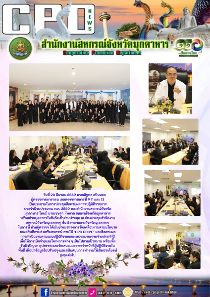 วันที่ 20 มีนาคม 2569 นายณัฐพล แป้นนอก ผู้ตรวจราชการกรม เขตตรวจราชการที่ 9 11 และ 13 เป็นประธานในการประชุมติดตามผลการปฏิบัติราชการ ประจำปีงบประมาณ พ.ศ. 2569 ของสำนักงานสหกรณ์จังหวัดมุกดาหาร โดยมี นายเชษฐา ไพศาล สหกรณ์จังหวัดมุกดาหาร พร้อมด้วยบุคลากรในสังกัดเข้าร่วมประชุม ณ ห้องประชุมสำนักงานสหกรณ์จังหวัดมุกดาหาร ชั้น 5 ศาลากลางจังหวัดมุกดาหาร ในการนี้ ท่านผู้ตรวจฯ ได้เน้นย้ำแนวทางการขับเคลื่อนงานตามนโยบายของอธิบดีกรมส่งเสริมสหกรณ์ ภายใต้ "CPD DRIVE" และติดตามผลการดำเนินงานตามแผนปฏิบัติงานและงบประมาณรายจ่ายประจำปี เพื่อให้การเบิกจ่ายและโครงการต่าง ๆ เป็นไปตามเป้าหมาย พร้อมทั้งรับฟังปัญหา อุปสรรค และข้อเสนอแนะจากเจ้าหน้าที่ผู้ปฏิบัติงานในพื้นที่ เพื่อนำข้อมูลไปปรับปรุงและสนับสนุนการทำงานให้เกิดประโยชน์สูงสุดต่อไป