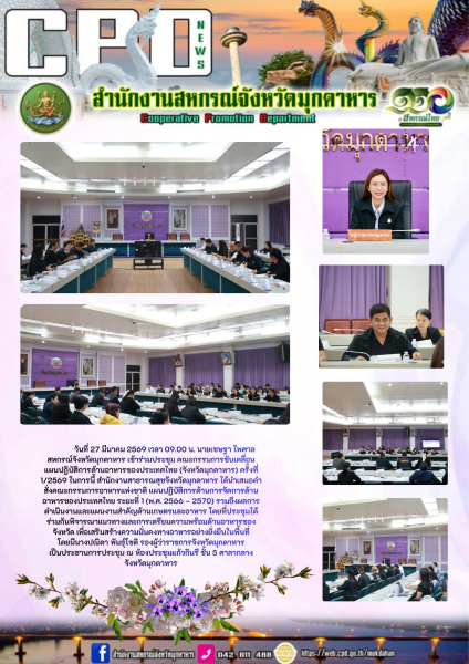 วันที่ 27 มีนาคม 2569 เวลา 09.00 น. นายเชษฐา ไพศาล สหกรณ์จังหวัดมุกดาหาร เข้าร่วมประชุม คณะกรรมการขับเคลื่อนแผนปฏิบัติการด้านอาหารของประเทศไทย (จังหวัดมุกดาหาร) ครั้งที่ 1/2569 ในการนี้ สำนักงานสาธารณสุขจังหวัดมุกดาหาร ได้นำเสนอคำสั่งคณะกรรมการอาหารแห่งชาติ แผนปฏิบัติการด้านการจัดการด้านอาหารของประเทศไทย ระยะที่ 1 (พ.ศ.2566 – 2570) รวมถึงผลการดำเนินงานและแผนงานสำคัญด้านเกษตรและอาหาร โดยที่ประชุมได้ร่วมกันพิจารณาแนวทางและการเตรียมความพร้อมด้านอาหารของจังหวัด เพื่อเสริมสร้างความมั่นคงทางอาหารอย่างยั่งยืนในพื้นที่ โดยมีนางปณิดา พันธุ์โชติ รองผู้ว่าราชการจังหวัดมุกดาหารเป็นประธานการประชุม ณ ห้องประชุมแก้วกินรี ชั้น 5 ศาลากลางจังหวัดมุกดาหาร