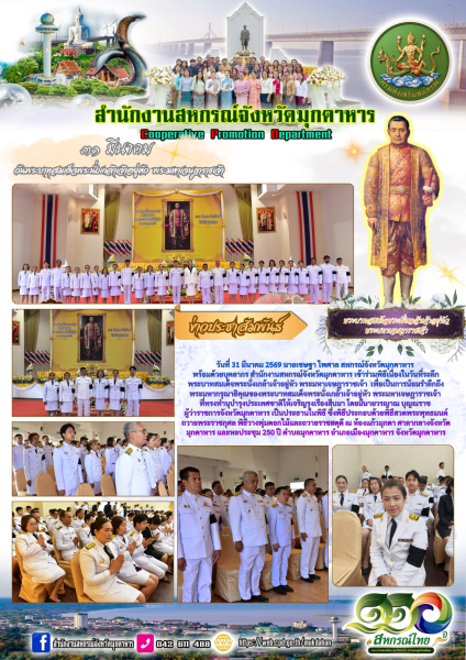 วันที่ 31 มีนาคม 2569 นายเชษฐา ไพศาล สหกรณ์จังหวัดมุกดาหารพร้อมด้วยบุคลากร สำนักงานสหกรณ์จังหวัดมุกดาหาร เข้าร่วมพิธีเนื่องในวันที่ระลึกพระบาทสมเด็จพระนั่งเกล้าเจ้าอยู่หัว พระมหาเจษฎาราชเจ้า เพื่อเป็นการน้อมรำลึกถึงพระมหากรุณาธิคุณของพระบาทสมเด็จพระนั่งเกล้าเจ้าอยู่หัว พระมหาเจษฎาราชเจ้าที่ทรงทำนุบำรุงประเทศชาติให้เจริญรุงเรืองสืบมา โดยมีนายวรญาณ บุญณราชผู้ว่าราชการจังหวัดมุกดาหาร เป็นประธานในพิธี ซึ่งพิธีประกอบด้วยพิธีสวดพระพุทธมนต์ถวายพระราชกุศล พิธีวางพุ่มดอกไม้และถวายราชสดุดี ณ ห้องแก้วมุกดา ศาลากลางจังหวัดมุกดาหาร และหอประชุม 250 ปี ตำบลมุกดาหาร อำเภอเมืองมุกดาหาร จังหวัดมุกดาหาร