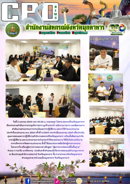วันที่ 2 เมษายน 2569 เวลา 09.00 น. นายเชษฐา ไพศาล สหกรณ์จังหวัดมุกดาหาร เป็นประธานดำเนินการประชุมข้าราชการ ลูกจ้างประจำ พนักงานราชการ และติดตามการดำเนินงานตามกรอบการประเมินผลการปฏิบัติงาน ผลการใช้จ่ายงบประมาณ ประจำปีงบประมาณ พ.ศ. 2569 ครั้งที่ 4/2569 ประจำเดือนเมษายน 2569 เพื่อประเมินคุณภาพของผลการปฏิบัติงานสำนักงานสหกรณ์จังหวัดมุกดาหาร พร้อมทั้งติดตามเร่งรัดการปฏิบัติงาน และงบประมาณรายจ่ายประจำปีของหน่วยงาน ให้เป็นไปตามนโยบายการบริหารการจัดสรรงบประมาณ ทั้งนี้ ได้มอบประกาศนียบัตรผู้ผ่านการอบรม โครงการโรงเรียนผู้ตรวจการสหกรณ์ หลักสูตร “ผู้ตรวจการสหกรณ์ขั้นพื้นฐาน”จำนวน 1 ราย คือ นางจิพรรณ ประดับชาติ ตำแหนงนักวิชาการสหกณณ์ชำนาญการการ ณ ห้องประชุมสำนักงานสหกรณ์ จังหวัดมุกดาหาร ชั้น 5 ศาลากลางจังหวัดมุกดาหาร ตำบลมุกดาหารอำเภอเมืองมุกดาหาร จังหวัดมุกดาหาร